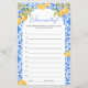 Découvrez l'histoire d'amour d'une manière divertissante avec notre "Où étaient-ils ?" Fête des mariées Game, avec le design captivant inspiré des tuiles méditerranéennes et l'allure rafraîchissante des citrons. Ce jeu interactif invitation vos invités à deviner les endroits où la mariée et le marié ont été capturés dans de charmantes photos, transformant la célébration en un voyage de souvenirs partagés et de rire. Chaque carte de jeu présente le design enchanteur des tuiles méditerranéennes, préparant le terrain pour une exploration ludique des aventures du couple. Des citrons vifs apportent un éclat de fraîcheur, reflétant l'esprit joyeux de la douche nuptiale. "Où étaient-ils ?" prend le devant de la scène, invitant les invités à participer à ce jeu de devinettes enchanteur. Personnalisez les cartes de jeu avec le nom du couple et la date de la douche nuptiale, créant un souvenir unique et mémorable pour les futurs mariés. L'ajout de détails personnalisables ajoute une touche personnelle au jeu, ce qui en fait une partie chère de la célébration. Conçu sur un stock de carton durable et de haute qualité, notre "Où étaient-ils ?" Fête des mariées Game allie divertissement et sophistication. Comme les clients s'adonnent à ce jeu de devinettes, ils partagent non seulement la joie du voyage du couple, mais contribuent également à l'ambiance animée de la douche nuptiale. Transformez votre douche nuptiale en une célébration interactive de l'amour et du rire avec notre "Où étaient-ils ?" Jeu de Fête des mariées. Inspirez les festivités de la douceur de l'esthétique d'inspiration méditerranéenne, créant une expérience inoubliable qui rapproche les clients du coeur de l'histoire d'amour.