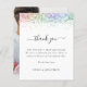 Un rapport qualité-prix BUDGET alternative sur une taille plus petite 4,5 x 5,6" semi-brillant poids 110lbs, qui est d'une épaisseur similaire à une carte postale (cependant ne convient pas à l'utilisation comme carte postale.) VEUILLEZ NOTER qu'il y a UN invitation par feuille. Parties scintillant arc-en-ciel budget Mariage photo Merci. Une touche de glamour avec une bordure en faux parties scintillant en haut et un script élégant avec des swashes pour le Merci. Sur le dos, remplacez l'exemple de photo par votre préféré de la journée comme souvenir pour vos invités. Personnalisez facilement le reste du texte avec votre message et vos noms.