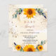 Un arrière - plan blanc et doré décoré de tournesols, de verdure d'eucalyptus et de feuilles dorés et de poussière de parties scintillant en faux or. Personnalisez et ajoutez un nom et des détails du parti.