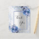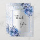 Faux arrière - plan d'apparence argentée, décoré de faux parties scintillant bleu clair, pétillants et flores bleues.À l'avant, gros caractères lettrés et le texte : Merci. Retour : Personnalisez et ajoutez votre note de remerciement et votre nom.