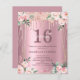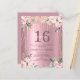Personnalisable douce 16ème invitation à l'anniversaire de papier abordable, avec de jolis bouquets floraux rose vif et verdure sur un arrière - plan rose chic, avec des gouttes de parties scintillant or rose et un cadre géométrique or.