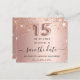 Une petite fille et tendance Enregistrer la carte Date pour une Quinceañera, 15e anniversaire fête. arrière - plan d'or rose décoré de confettis d'or rose. Personnalisez et ajoutez une date et un nom/texte. Le texte : Save the Date est écrit avec un grand script de style à la main tendance avec des swashes. Numéro 15 avec une police de style ballon.