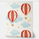 Motif mignon en pépinière avec des montgolfières rayées rouges, des nuages bleus doux et des étoiles.