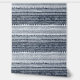 Papier peint bleu et blanc avec un motif géométrique en rayures et formes dessinées.