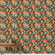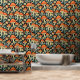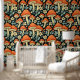 Papier peint avec illustration de champignons rétro, fleurs vintages aux couleurs vintages de bleu foncé, orange et beige.