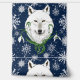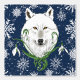 Un loup blanc arctique aux fleurs de neige dessinées dans un style Art nouveau. Un fond bleu foncé et des flocons de neige derrière et autour du loup arctique.
