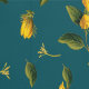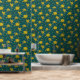 Wallpaper with flowering St. John's Wort pattern. Big yellow flowers, with buds, leaves and stems, are printed in a seamless, repeating pattern over a very dark teal blue color.