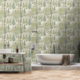 Une illustration d'art d'imaginaire de style moderne, très agréable, représente divers pins verts, grands, clairs, moyens et foncés, avec un arrière - plan crémeux