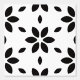 A chic black and white abstract floral print features elegant black flower petal shapes on a crisp white background.