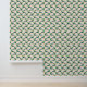 Accentuer n'importe quelle chambre avec ce papier peint représentant un motif de style mi-siècle aux accents simples de palmiers en orange et vert autour d'une oasis en forme de boomerang ou d'une piscine dans un bleu d'eau vive. La couleur arrière - plan de sable peut être modifiée.