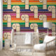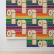 Éclairez votre salle de bain avec ce papier peint amusant avec des rouleaux de papier toilette blanc beige rétro sur un arrière - plan à rayures arc-en-ciel avec de minuscules coeurs.