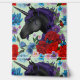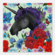Une licorne noire avec des fleurs violettes et rouges sur fond de sauge vert