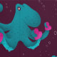 A playful underwater pattern featuring teal octopuses holding bright pink hearts, set against a deep maroon background with scattered air bubbles.