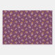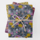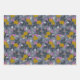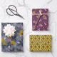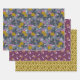Correspondance papier d'emballage avec divers motifs floraux en or riche, vin chaud, rose pavot et bleu gris profond.