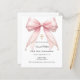 A white background, decorated with a pink large bow with pearls and a golden cross. Personalize and add a name and details details.