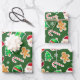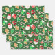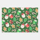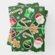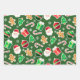 Arrière - plan vert foncé avec des photos de Père Noël, sucres de canne, biscuits de pain d'épices, flocons de neige, arbres de Noël, et des cadeaux qui ressemblent à des autocollants. Papier amusant pour enfants ou adultes.
