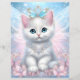 Une adorable princesse fée chaton blanc avec des bijoux, des fleurs roses et des ailes de fée sur un fond bleu scintillant.