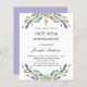 Un arrière - plan blanc décoré de fleurs de lavande et de verdure d'eucalyptus. Personnalisez et un nom et des détails. Retour : lavande, arrière - plan violet. 1 feuille = 1 invitation