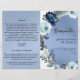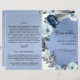 Elegante programa de quinceañera con hermoso arreglo floral en acuearela en varios tonos de azúl y detalles en imitación de aluminio azul. Uso de elegante caligrafía moderna. Nuestro texto es solo un ejemplo, ya que puedes agregar cualquier información o mensaje que prefieras. Puedes hacer ajustements de tamaño de texto, color y estilo seleccionando "seguir personalizando". NOTA : Este programa es enviado plano y REQUIERE QUE LO DOBLE MANUALMENTE en casa. Se recomienda el tipo de papel seleccionado por neñador. Invitación que coordina disponible. Este mismo programa esta disponible también en Inglés. Parte de nuestra colección "Elegant Blue Watercolor Floral Quinceañera", con variedad de productos para coordinar disponibles.