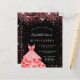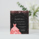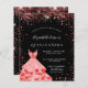 Une invitation moderne, élégante et glamour pour une Quinceañera, 15ème anniversaire. Un arrière - plan noir chic avec de la poussière de parties scintillant en faux rouge et une robe. Le nom est écrit avec un script de style moderne écrit à la main. Personnalisez et ajoutez les détails de votre fête.