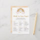 Ces élégantes cartes What's In Your Purse sont une excellente façon de lancer le plaisir à votre Baby shower et garanti d'être un grand succès! Il vous suffit de les faire circuler pendant le Baby shower où vous pourrez vous amuser en fouillant votre sac à main et en lisant les articles qu'ils ont dans la liste. La personne qui a le plus de points gagne ! Le design présente notre arc-en-ciel dessiné à la main et des nuages dans des tons neutres de la terre avec des étoiles de parties scintillant en faux or.