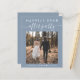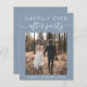 Étage bleu poussiéreux et économique ou faire-part de mariage privé et accueil ou fête de fête. L'avant présente "Happily Ever After Party" dans la typographie blanche moderne et un script blanc élégant avec des swashes, votre photo, les noms et la date mariage. Au contraire, personnalisez votre faire-part mariage et votre invitation à la réception, créez facilement un code QR lié à votre site mariage pour que les invités puissent scanner pour voir vos photos mariages, tous les détails et RSVP en ligne, et ajoutez vos noms dans un script signature.