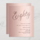 Une invitation design et moderne pour une fête du 80e anniversaire. arrière - plan rose dégradé or et le mot Eighty écrit avec d'élégantes grandes lettres de script en or rose foncé. Personnalisez et ajoutez un nom et des détails du parti. 1 feuille = 1 invite imprimé bord à bord.
