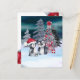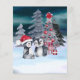 Scène de sapin de Noël de pingouin à petit budget - une carte de vacances très mignonne de Ricaso représentant deux petits pingouins devant un sapin de Noël orné de boules rouges et d'une fleur de poinsettia dans une forêt enneigée