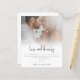 Une alternative BUDGETAIRE économique dans un format plus petit de 4,5 x 5,6” avec une finition semi-brillant de 110lbs, d'une épaisseur similaire à celle d'une carte postale (mais ne convient pas comme carte postale). VEUILLEZ NOTER qu'il y en a UN par feuille. Budget Photo Script Engagement Love and Thanks. Un design moderne pour dire merci après votre fête de fiançailles, avec un script informel prédéfini Love and Thanks, sous votre photo en haut et le reste du texte que vous pouvez facilement personnaliser. Choisissez une photo de vous deux et remplacez la photo exemple dans l'espace réservé du modèle par la vôtre.