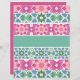 Une série de motifs géométriques colorés forme un design symétrique, qui rappelle l'oeuvre traditionnelle en tuiles. Chaque bande présente une couleur dominante, comme le rose, le bleu ou le vert, avec des textures d'aquarelle, créant une composition visuellement harmonieuse.