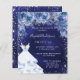 Une invitation moderne, élégante et glamour pour une fête Sweet 16, 16e anniversaire. Un arrière - plan de marine avec des étincelles de parties scintillant faux argent, une robe et des roses bleus, des fleurs. La couleur bleue de l'arrière - plan est inégale. Le nom est écrit avec un script de style moderne écrit à la main. Personnalisez et ajoutez les détails de votre fête.