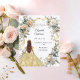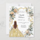 Un arrière - plan à l'allure d'or. Décoré de fleurs blanches et jaunes et d'un ruban doré. Une fille portant une tiare et une robe. Personnalisez et ajoutez un nom et des détails. Retour : un faux arrière - plan d'or. 1 feuille = 1 invite imprimé bord à bord.