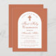 Une première invitation à la communion pour un garçon. D'une couleur moderne. marron en terre cuite, il a une arche blanche avec du texte en terre cuite à l'intérieur. L'occasion et le nom sont écrits dans un élégant script calligraphique ; la première ligne est du texte arché.