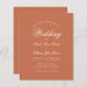 Une faire-part de mariage économique simple et minimaliste. Il n'a que du texte blanc sur l'arrière - plan en terre cuite. Le mot Mariage et les noms sont écrits dans un élégant script calligraphique. La terre cuite est une couleur brun rougeâtre, moderne, naturelle, terreuse.