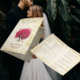 Papier Whimsical Fuchsia Heart Leaf Tree Wedding Programm