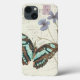 © Pela Studio / Wild Apple. A blue and brown butterfly with purple flowers and stems. An off white background with French text can be seen on the image.