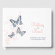 Beaux papillons d'art encastré et mariage graphique floral tourbillon en corail rose-orange, crème, bleu ciel et bleu foncé. Personnalisez avec vos propres noms et date mariage. Art dessiné à l'encre de papillon et design graphique par Sarah Trett pour www.mylittleedenweddings.com