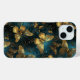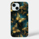 Un élégant Coque iPhone 15 (à peine là) avec des papillons motif dans des teintes dorées et des bleus brillants.