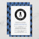Masculine golf birthday party invitation custom design features a male golfer silhouette in classic black set on a white shape bordered with humourous curved text "It's Time To Par Tee!" in crisp white font on a black circle. Customize the template with the name & details in classic black & royal blue lettering. The invitation is bordered with a classic black & royal blue argyle-style plaid which also repeats on the back of the invitation.