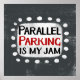 "Parallel Parking Is My Jam" is a cute text design in grey with black and red text, along with a white accent shape and white textured whimsical dots surrounding it.