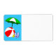 Une grande étiquette vierge avec une illustration amusante sur le thème de la plage ou de la piscine, représentant un ballon de plage rouge, un parasol vert, des sandales de vacances et de l'huile solaire sur un fond bleu aqueux avec des vagues ondulées. Cliquez sur Personnaliser pour modifier les polices, les éléments, la taille de l'étiquette, etc., et même enregistrer votre création pour plus tard.