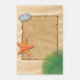 Ancien papier parchemin avec feuille de palme, pierre et étoiles de mer sur sable de plage arrière - plan.