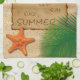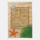 Ancien papier parchemin avec feuille de palme, pierre et étoiles de mer sur sable de plage arrière - plan. Simplement été : coucher du soleil, rivage, sable, coquillages, mer, nage, soleil, surf.