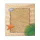 Old parchment paper with palm leaf, stone and starfish on beach sand background.