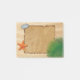 Old parchment paper with palm leaf, stone and starfish on beach sand background.