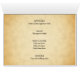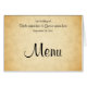 A wedding menu design with a printed background design in the style of vintage old paper, designed to look similar to a faux parchment pattern. The background is a pattern print in yellowy beige / tan colours. There is stylish black text that can be personalized.