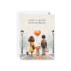 A cute back-to-school postcard with an illustration of a cute schoolgirl holding hands with his parents and with the default customizable text "we'll be on your side for the very first day!" text. There is also a puppy accompanying the family.