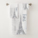 Le design présente la tour Eiffel et ses fleurs bleues.