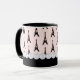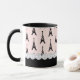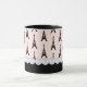 Pretty parisian chic coffee mug features eiffel towers on a pink background topped with ivory pearls.