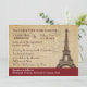 Start off a romantic Parisian destination wedding with an unusual invitation meant to look like a postcard from a bygone era. The background is made to look like an aged letter with subtle engraving, cursive handwriting and visa and postage stamps. The Eiffel Tower is dominant on top of a maroon panel. The paper background is repeated on the reverse to highlight extra information for your guests with a website at the bottom. Available with matching products.